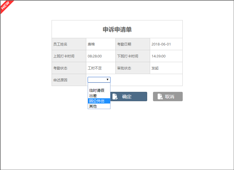我的出勤明细: 显示当前考勤周期里每天的打卡时间和考勤状态,并可根据考勤状态查询。如果您对考勤状态有异议的时候,可以向上级提出申诉,领导审批后可修改考勤状态。点击有异常的明细后面的申诉标识,会弹出申诉申请单。在申诉申请单里选择相应的申诉原因,并确定。