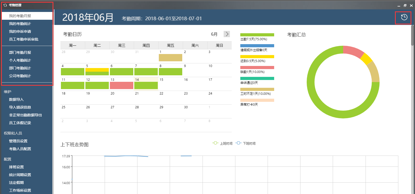 上下班走势图: 提供上班时间和下班时间的走势信息数据,用折线图展现上下班时间的趋势。