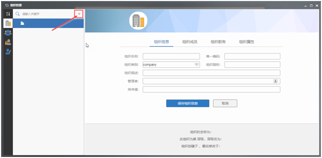 从组织管理应用中进入组织管理界面后,点击左侧上方的添加按钮,如下图所示:
